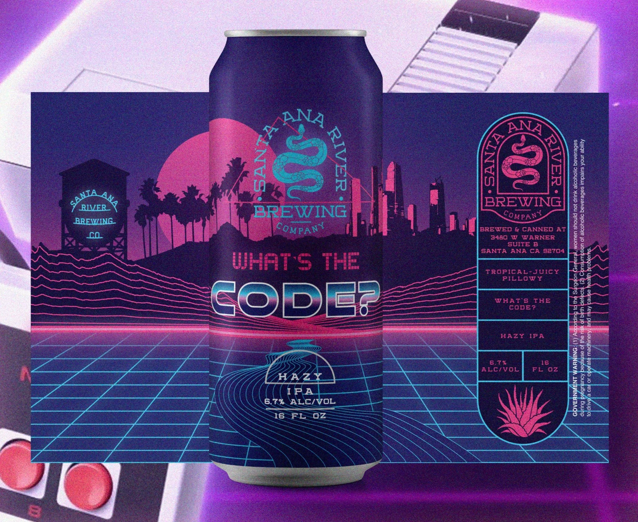 • What’s the Code? – Hazy IPA This retro-futuristic label channels 1980s synthwave aesthetics, complete with neon grids, palm trees, and a glowing skyline. Inspired by vintage gaming and SoCal nights, the design delivers a perfect visual metaphor for the beer’s juicy, dreamy haze.